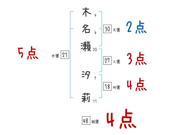 天運![]() | 木名瀬汐莉さんの天運は30画の2つ星!浮き沈みの激しさに注意しましょう。 家系が持つ宿命的な運勢を表します。祖先から受け継いだ苗字ですので自分の力が及びません。家柄を象徴します。 |