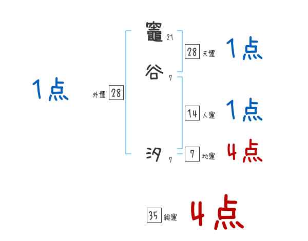天運![]() | 竈谷汐さんの天運は28画の1つ星!家庭環境に注意。スポーツで活躍できる能力があるかも。 家系が持つ宿命的な運勢を表します。祖先から受け継いだ苗字ですので自分の力が及びません。家柄を象徴します。 |