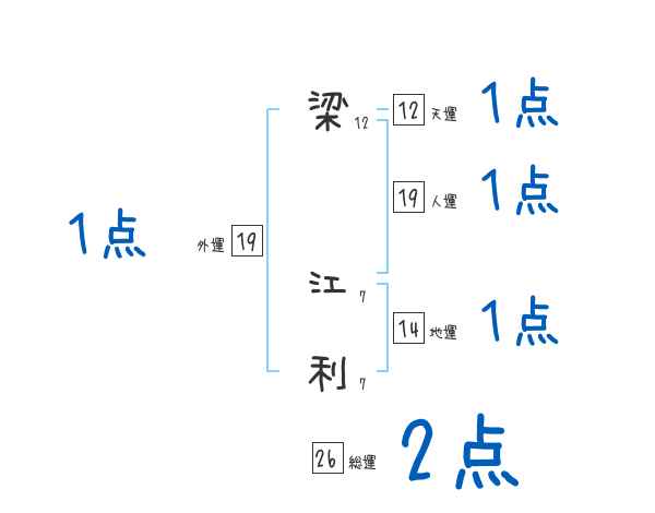 人運![]() | 梁江利さんの人運は19画の1つ星!優れた才能を持ちますが、協調性が足りないことも。周りの人と協力する事を意識しましょう。 性格や才能などを表す2番目に重要な運勢です。人間関係や協調性、社会的な成功に影響します。主に20歳から50歳ぐらいまでの中年期の運勢を表します。 |