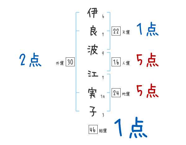 人運![]() | 伊良波江実子さんの人運は16画の5つ星!人望が厚く大きく発展する。逆転成功が見える。 性格や才能などを表す2番目に重要な運勢です。人間関係や協調性、社会的な成功に影響します。主に20歳から50歳ぐらいまでの中年期の運勢を表します。 |