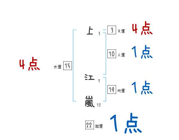 天運![]() | 上江嵐さんの天運は3画の4つ星!活動的で才能に恵まれ、多くの信頼を得る。希望に満ち成長する。 家系が持つ宿命的な運勢を表します。祖先から受け継いだ苗字ですので自分の力が及びません。家柄を象徴します。 |