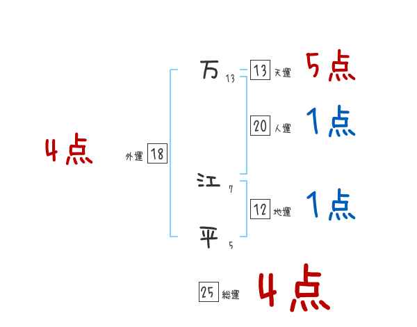 天運![]() | 万江平さんの天運は13画の5つ星!才能に恵まれ人気がある。名声を手に入れる。円満な人生。 家系が持つ宿命的な運勢を表します。祖先から受け継いだ苗字ですので自分の力が及びません。家柄を象徴します。 |
