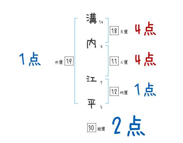 天運![]() | 溝内江平さんの天運は18画の4つ星!情熱的で剛気。忍耐力があり信頼される。 家系が持つ宿命的な運勢を表します。祖先から受け継いだ苗字ですので自分の力が及びません。家柄を象徴します。 |