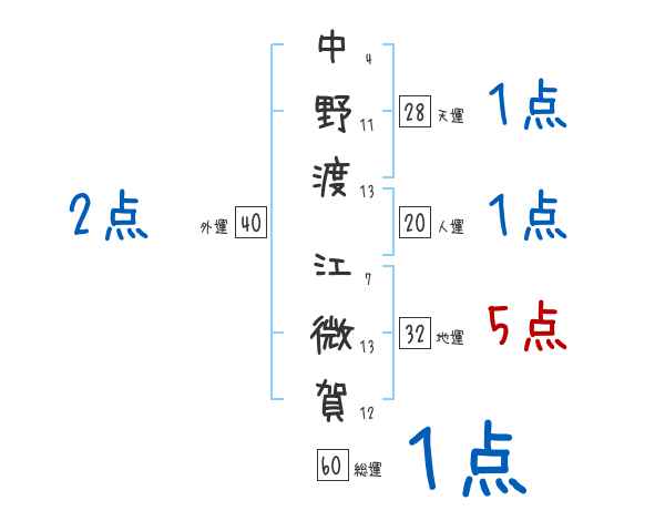 地運![]() | 中野渡江微賀さんの地運は32画の5つ星!柔軟性があり成功する。チャンスが多く金運が良い。 個性を表す基礎的な運勢です。性格形成や対人関係、行動力など家庭環境に影響されます。主に誕生してから20歳くらいまでの若年期の運勢を表します。 |