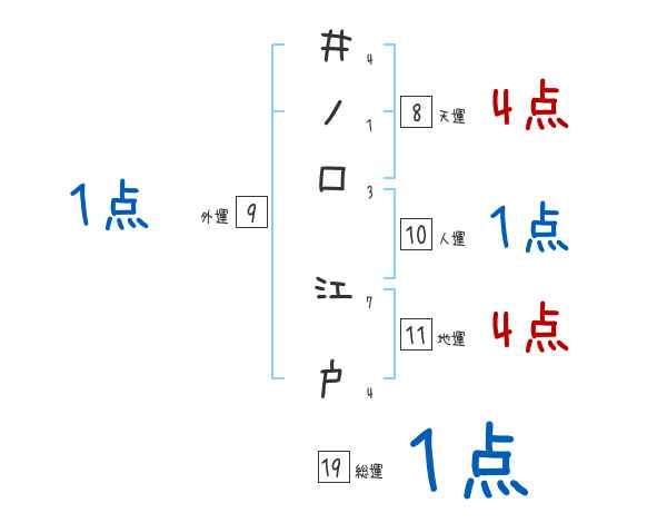 総運![]() | 井ノ口江戸さんの総運は19画の1つ星!優れた才能を持ちますが、協調性が足りないことも。周りの人と協力する事を意識しましょう。 あなたの人生を表す1番重要な運勢です。生涯を通じて影響する総合運となり、主に50歳以降の晩年期に影響を及ぼします。 |