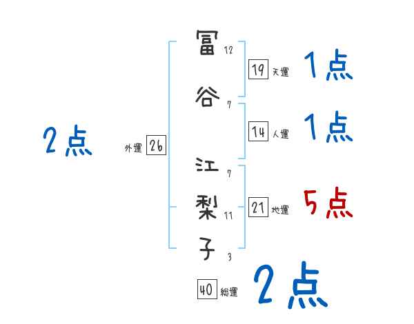 外運![]() | 冨谷江梨子さんの外運は26画の2つ星!波瀾万丈かも。信頼できる人を大事にしましょう。 生活面を象徴する運勢です。外部から受ける影響力を表し、結婚運、家庭運や職場、環境への順応性を表します。 |