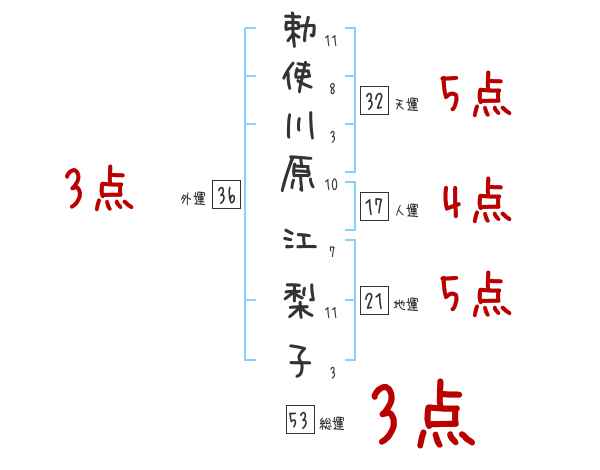 総運![]() | 勅使川原江梨子さんの総運は53画の3つ星!やや見栄っ張りで虚栄心がある。散財に注意。 あなたの人生を表す1番重要な運勢です。生涯を通じて影響する総合運となり、主に50歳以降の晩年期に影響を及ぼします。 |
