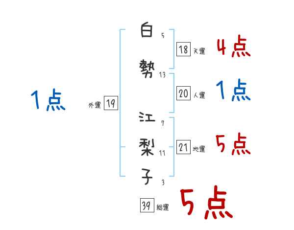 外運![]() | 白勢江梨子さんの外運は19画の1つ星!優れた才能を持ちますが、協調性が足りないことも。周りの人と協力する事を意識しましょう。 生活面を象徴する運勢です。外部から受ける影響力を表し、結婚運、家庭運や職場、環境への順応性を表します。 |
