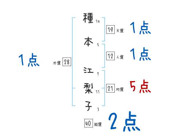 外運![]() | 種本江梨子さんの外運は28画の1つ星!家庭環境に注意。スポーツで活躍できる能力があるかも。 生活面を象徴する運勢です。外部から受ける影響力を表し、結婚運、家庭運や職場、環境への順応性を表します。 |