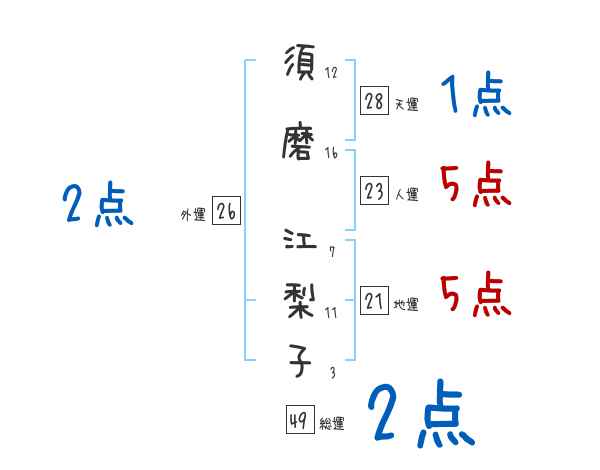 天運![]() | 須磨江梨子さんの天運は28画の1つ星!家庭環境に注意。スポーツで活躍できる能力があるかも。 家系が持つ宿命的な運勢を表します。祖先から受け継いだ苗字ですので自分の力が及びません。家柄を象徴します。 |
