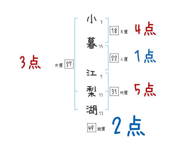 外運![]() | 小暮江梨湖さんの外運は27画の3つ星!頭脳明晰だが強情で摩擦が多い傾向。孤立に注意。 生活面を象徴する運勢です。外部から受ける影響力を表し、結婚運、家庭運や職場、環境への順応性を表します。 |