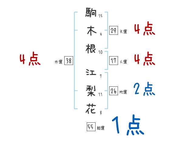 総運![]() | 駒木根江梨花さんの総運は55画の1つ星!欲張りな性格で軽率な行動に注意しましょう。病気に気をつけて。 あなたの人生を表す1番重要な運勢です。生涯を通じて影響する総合運となり、主に50歳以降の晩年期に影響を及ぼします。 |