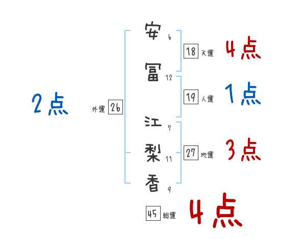天運![]() | 安冨江梨香さんの天運は18画の4つ星!情熱的で剛気。忍耐力があり信頼される。 家系が持つ宿命的な運勢を表します。祖先から受け継いだ苗字ですので自分の力が及びません。家柄を象徴します。 |