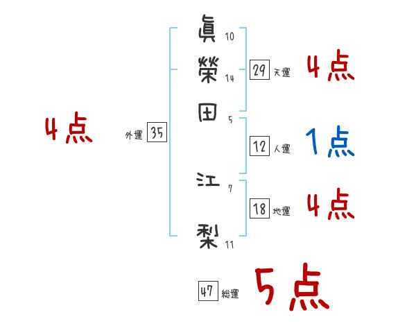 総運![]() | 眞榮田江梨さんの総運は47画の5つ星!実力が開花し発展する円満な人生。財に恵まれる。 あなたの人生を表す1番重要な運勢です。生涯を通じて影響する総合運となり、主に50歳以降の晩年期に影響を及ぼします。 |