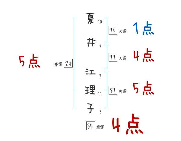 外運![]() | 夏井江理子さんの外運は24画の5つ星!家庭運が良く順調な人生。金運にも恵まれる。 生活面を象徴する運勢です。外部から受ける影響力を表し、結婚運、家庭運や職場、環境への順応性を表します。 |