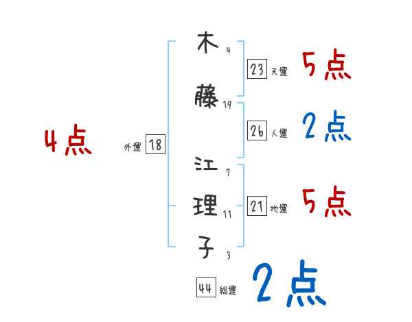 総運![]() | 木藤江理子さんの総運は44画の2つ星!誠実で慎重な性格。物事を考えすぎないように注意しましょう。 あなたの人生を表す1番重要な運勢です。生涯を通じて影響する総合運となり、主に50歳以降の晩年期に影響を及ぼします。 |
