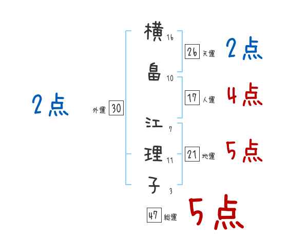 総運![]() | 横畠江理子さんの総運は47画の5つ星!実力が開花し発展する円満な人生。財に恵まれる。 あなたの人生を表す1番重要な運勢です。生涯を通じて影響する総合運となり、主に50歳以降の晩年期に影響を及ぼします。 |