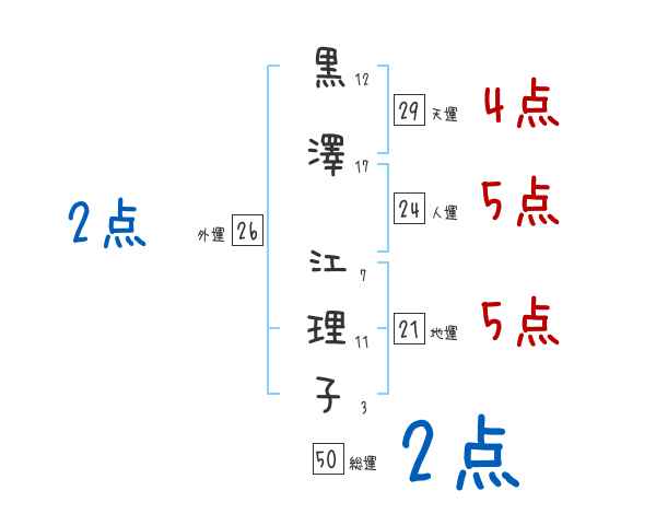 天運![]() | 黒澤江理子さんの天運は29画の4つ星!完全主義で才能がある。厳格な心の持ち主。 家系が持つ宿命的な運勢を表します。祖先から受け継いだ苗字ですので自分の力が及びません。家柄を象徴します。 |