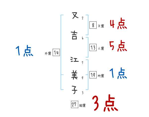 外運![]() | 又吉江美子さんの外運は14画の1つ星!人に対して優しいがストレスを溜め込みがち。人間関係のトラブルを避けるよう気をつけましょう。 生活面を象徴する運勢です。外部から受ける影響力を表し、結婚運、家庭運や職場、環境への順応性を表します。 |