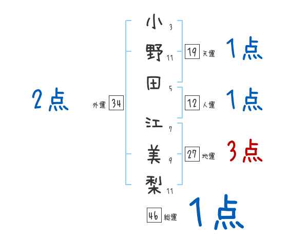 外運![]() | 小野田江美梨さんの外運は34画の2つ星!独創性に優れるが、自尊心が強く災難に注意しましょう。 生活面を象徴する運勢です。外部から受ける影響力を表し、結婚運、家庭運や職場、環境への順応性を表します。 |