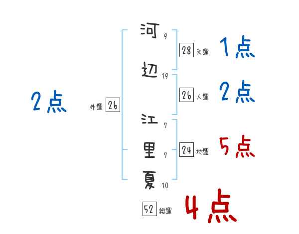 外運![]() | 河辺江里夏さんの外運は26画の2つ星!波瀾万丈かも。信頼できる人を大事にしましょう。 生活面を象徴する運勢です。外部から受ける影響力を表し、結婚運、家庭運や職場、環境への順応性を表します。 |