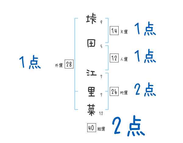 外運![]() | 垰田江里菜さんの外運は28画の1つ星!家庭環境に注意。スポーツで活躍できる能力があるかも。 生活面を象徴する運勢です。外部から受ける影響力を表し、結婚運、家庭運や職場、環境への順応性を表します。 |