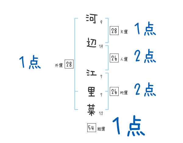 天運![]() | 河辺江里菜さんの天運は28画の1つ星!家庭環境に注意。スポーツで活躍できる能力があるかも。 家系が持つ宿命的な運勢を表します。祖先から受け継いだ苗字ですので自分の力が及びません。家柄を象徴します。 |