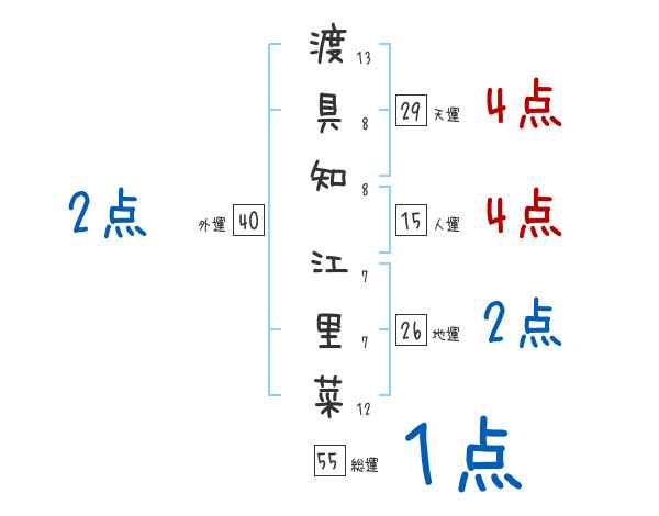 天運![]() | 渡具知江里菜さんの天運は29画の4つ星!完全主義で才能がある。厳格な心の持ち主。 家系が持つ宿命的な運勢を表します。祖先から受け継いだ苗字ですので自分の力が及びません。家柄を象徴します。 |