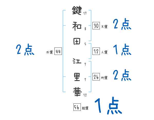 天運![]() | 鍵和田江里華さんの天運は30画の2つ星!浮き沈みの激しさに注意しましょう。 家系が持つ宿命的な運勢を表します。祖先から受け継いだ苗字ですので自分の力が及びません。家柄を象徴します。 |