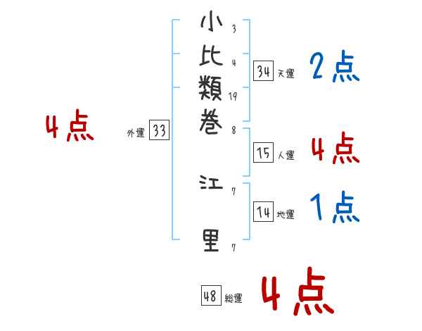 天運![]() | 小比類巻江里さんの天運は34画の2つ星!独創性に優れるが、自尊心が強く災難に注意しましょう。 家系が持つ宿命的な運勢を表します。祖先から受け継いだ苗字ですので自分の力が及びません。家柄を象徴します。 |