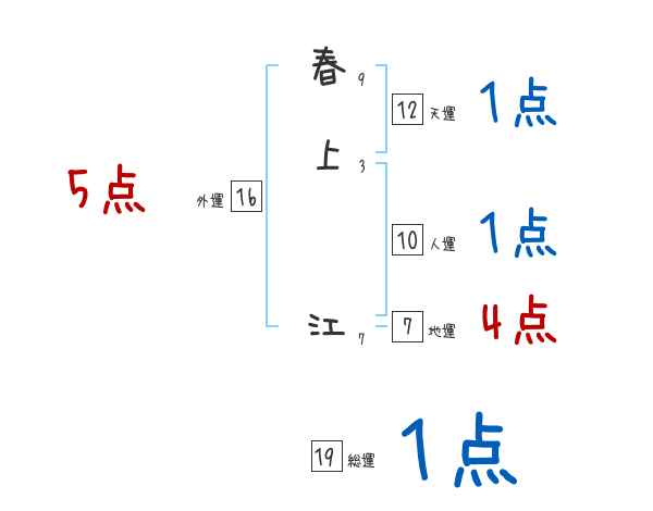 地運![]() | 春上江さんの地運は7画の4つ星!強い意志や信念を持ち独立心が強い。自立する。 個性を表す基礎的な運勢です。性格形成や対人関係、行動力など家庭環境に影響されます。主に誕生してから20歳くらいまでの若年期の運勢を表します。 |