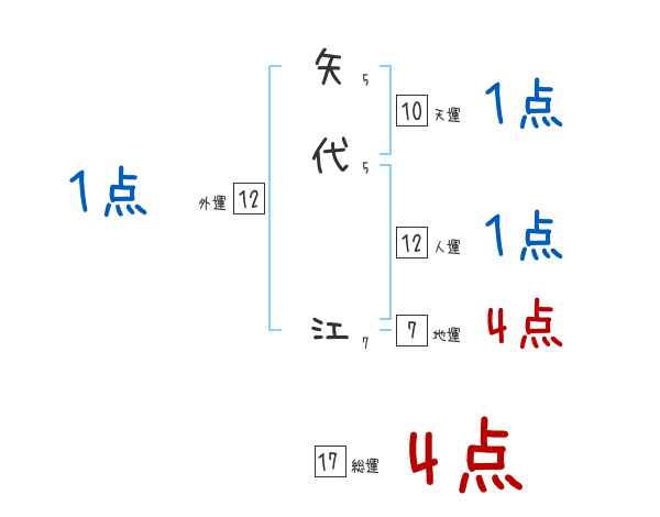天運![]() | 矢代江さんの天運は10画の1つ星!不安を感じやすい傾向。ストレスを抱えないように注意しましょう。 家系が持つ宿命的な運勢を表します。祖先から受け継いだ苗字ですので自分の力が及びません。家柄を象徴します。 |