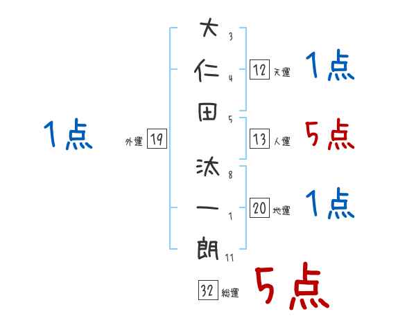総運![]() | 大仁田汰一朗さんの総運は32画の5つ星!柔軟性があり成功する。チャンスが多く金運が良い。 あなたの人生を表す1番重要な運勢です。生涯を通じて影響する総合運となり、主に50歳以降の晩年期に影響を及ぼします。 |