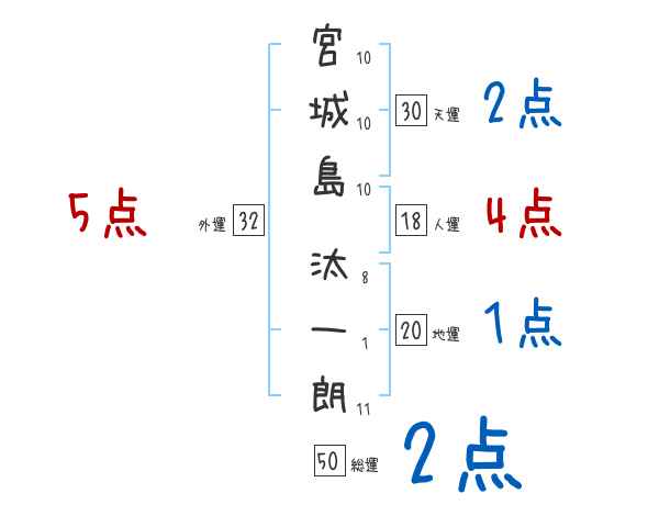 外運![]() | 宮城島汰一朗さんの外運は32画の5つ星!柔軟性があり成功する。チャンスが多く金運が良い。 生活面を象徴する運勢です。外部から受ける影響力を表し、結婚運、家庭運や職場、環境への順応性を表します。 |