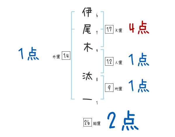 総運![]() | 伊尾木汰一さんの総運は26画の2つ星!波瀾万丈かも。信頼できる人を大事にしましょう。 あなたの人生を表す1番重要な運勢です。生涯を通じて影響する総合運となり、主に50歳以降の晩年期に影響を及ぼします。 |