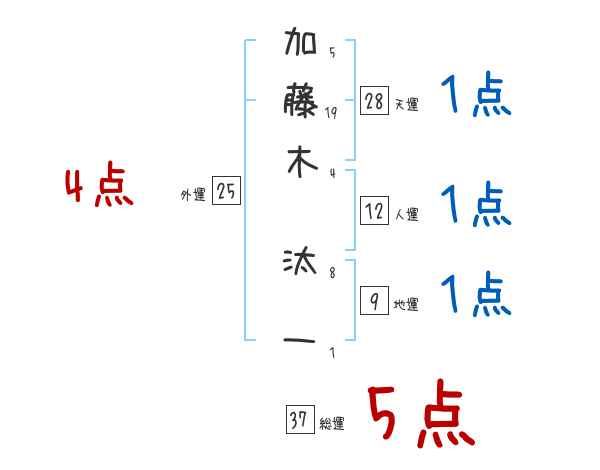 天運![]() | 加藤木汰一さんの天運は28画の1つ星!家庭環境に注意。スポーツで活躍できる能力があるかも。 家系が持つ宿命的な運勢を表します。祖先から受け継いだ苗字ですので自分の力が及びません。家柄を象徴します。 |