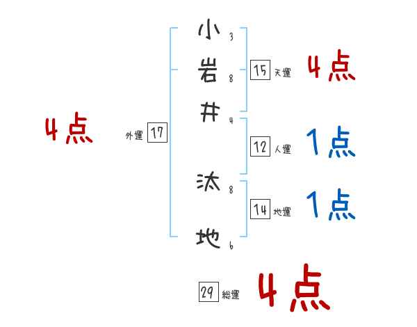 総運![]() | 小岩井汰地さんの総運は29画の4つ星!完全主義で才能がある。厳格な心の持ち主。 あなたの人生を表す1番重要な運勢です。生涯を通じて影響する総合運となり、主に50歳以降の晩年期に影響を及ぼします。 |