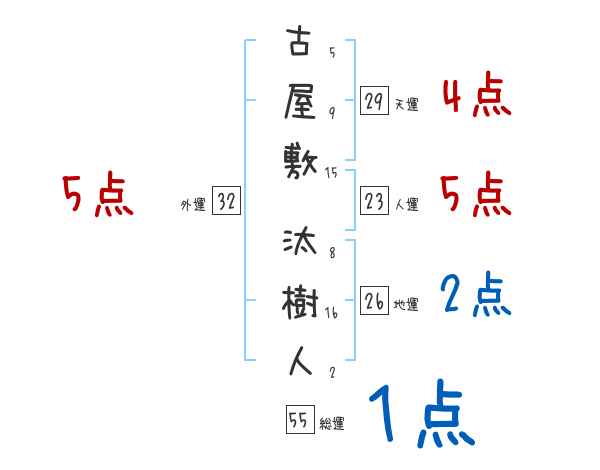 外運![]() | 古屋敷汰樹人さんの外運は32画の5つ星!柔軟性があり成功する。チャンスが多く金運が良い。 生活面を象徴する運勢です。外部から受ける影響力を表し、結婚運、家庭運や職場、環境への順応性を表します。 |