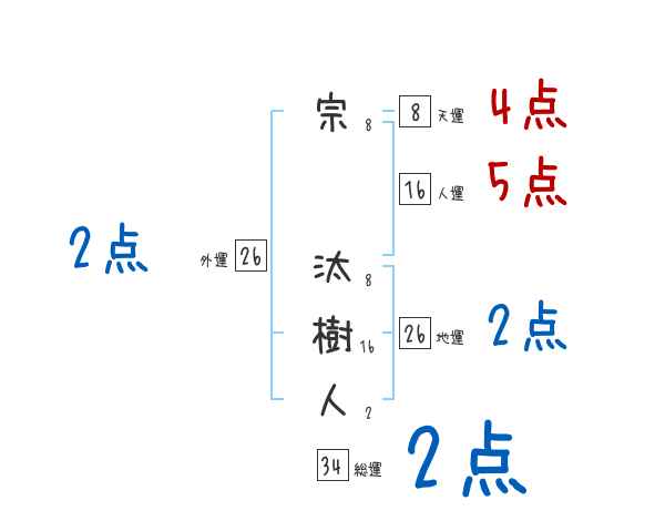 天運![]() | 宗汰樹人さんの天運は8画の4つ星!勤勉家。根気強く努力し成功する。忍耐力がある。 家系が持つ宿命的な運勢を表します。祖先から受け継いだ苗字ですので自分の力が及びません。家柄を象徴します。 |