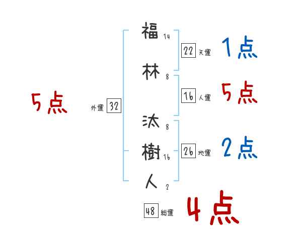 人運![]() | 福林汰樹人さんの人運は16画の5つ星!人望が厚く大きく発展する。逆転成功が見える。 性格や才能などを表す2番目に重要な運勢です。人間関係や協調性、社会的な成功に影響します。主に20歳から50歳ぐらいまでの中年期の運勢を表します。 |