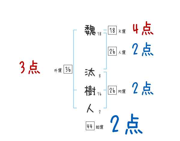 天運![]() | 魏汰樹人さんの天運は18画の4つ星!情熱的で剛気。忍耐力があり信頼される。 家系が持つ宿命的な運勢を表します。祖先から受け継いだ苗字ですので自分の力が及びません。家柄を象徴します。 |