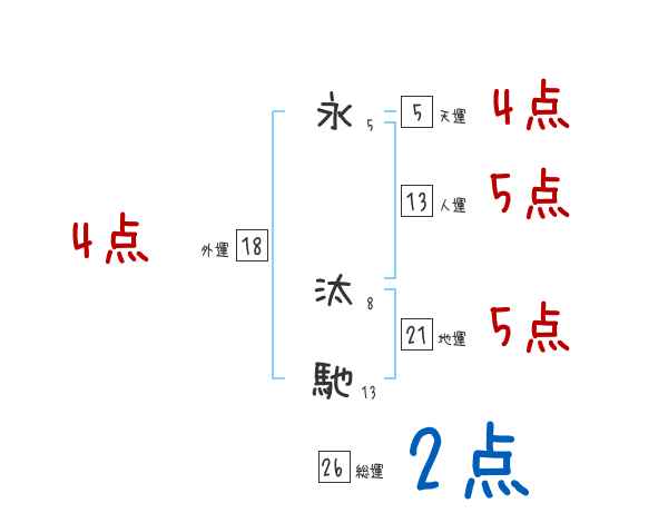 天運![]() | 永汰馳さんの天運は5画の4つ星!健康で安泰。協調性に優れ、財産に恵まれる。 家系が持つ宿命的な運勢を表します。祖先から受け継いだ苗字ですので自分の力が及びません。家柄を象徴します。 |