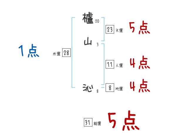 天運![]() | 櫨山沁さんの天運は23画の5つ星!想像力に優れ活力がある。一代で成功し名誉を手に入れる。 家系が持つ宿命的な運勢を表します。祖先から受け継いだ苗字ですので自分の力が及びません。家柄を象徴します。 |
