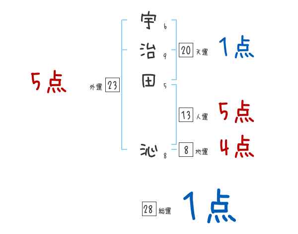 総運![]() | 宇治田沁さんの総運は28画の1つ星!家庭環境に注意。スポーツで活躍できる能力があるかも。 あなたの人生を表す1番重要な運勢です。生涯を通じて影響する総合運となり、主に50歳以降の晩年期に影響を及ぼします。 |