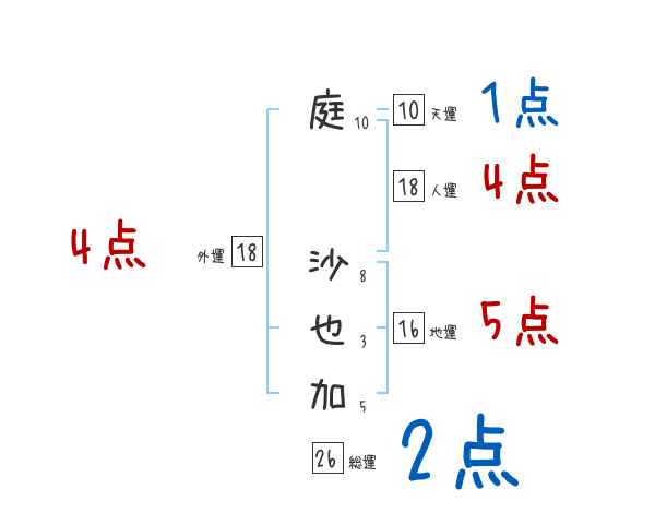 外運![]() | 庭沙也加さんの外運は18画の4つ星!情熱的で剛気。忍耐力があり信頼される。 生活面を象徴する運勢です。外部から受ける影響力を表し、結婚運、家庭運や職場、環境への順応性を表します。 |