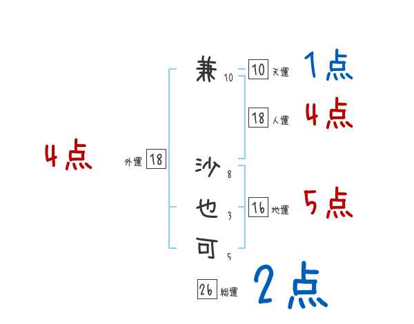 天運![]() | 兼沙也可さんの天運は10画の1つ星!不安を感じやすい傾向。ストレスを抱えないように注意しましょう。 家系が持つ宿命的な運勢を表します。祖先から受け継いだ苗字ですので自分の力が及びません。家柄を象徴します。 |