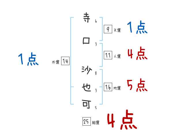 天運![]() | 寺口沙也可さんの天運は9画の1つ星!消極的で才能を発揮することが苦手なことも。周りの意見に耳を傾けましょう。 家系が持つ宿命的な運勢を表します。祖先から受け継いだ苗字ですので自分の力が及びません。家柄を象徴します。 |