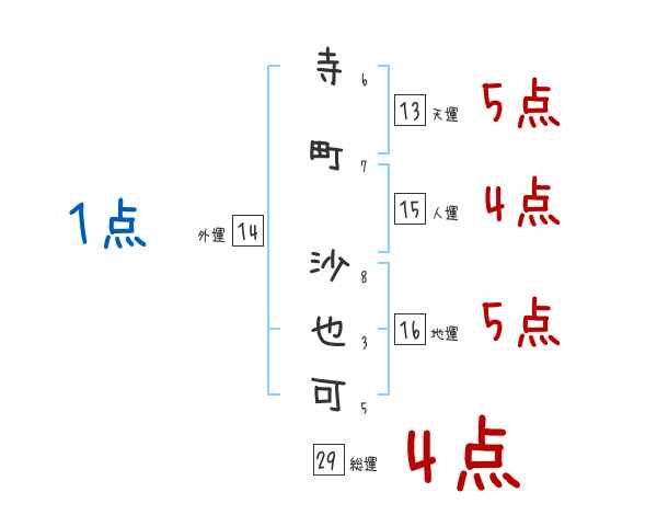天運![]() | 寺町沙也可さんの天運は13画の5つ星!才能に恵まれ人気がある。名声を手に入れる。円満な人生。 家系が持つ宿命的な運勢を表します。祖先から受け継いだ苗字ですので自分の力が及びません。家柄を象徴します。 |