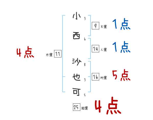地運![]() | 小西沙也可さんの地運は16画の5つ星!人望が厚く大きく発展する。逆転成功が見える。 個性を表す基礎的な運勢です。性格形成や対人関係、行動力など家庭環境に影響されます。主に誕生してから20歳くらいまでの若年期の運勢を表します。 |