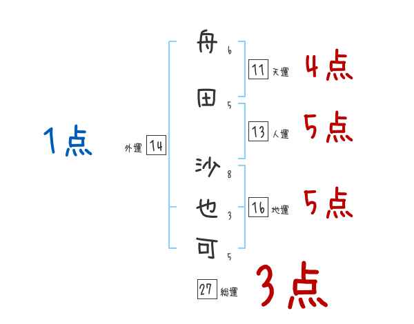 天運![]() | 舟田沙也可さんの天運は11画の4つ星!着実に富や地位を得る幸運な人生。 家系が持つ宿命的な運勢を表します。祖先から受け継いだ苗字ですので自分の力が及びません。家柄を象徴します。 |